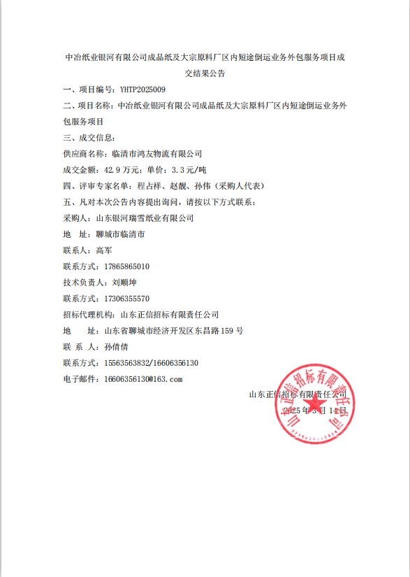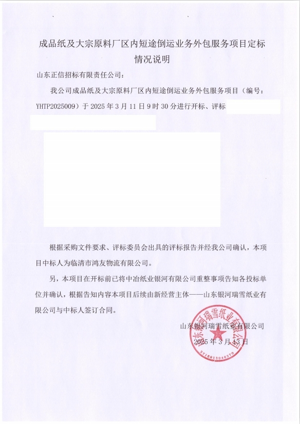 中冶紙業(yè)銀河有限公司成品紙及大宗原料廠區(qū)內(nèi)短途倒運(yùn)業(yè)務(wù)外包服務(wù)項(xiàng)目成 交結(jié)果公告 作者:管理員 來源:項(xiàng)目 點(diǎn)擊:次 字號(hào):大中小 上一篇:山東裕龍石化有限公司裕龍島煉化一體化項(xiàng)目(一期)生產(chǎn)期焊材框架采購項(xiàng)目 中標(biāo)候選人公示 下一篇: 杭州市路橋集團(tuán)股份有限公司聊城整車試驗(yàn)道路及動(dòng)態(tài)測(cè)試場地項(xiàng)目2025年勞務(wù)分包服務(wù)招標(biāo)項(xiàng)目 中標(biāo)候選人公示 分享到:QQ空間新浪微博騰訊微博人人網(wǎng)分享到微信朋友圈! ? ?
