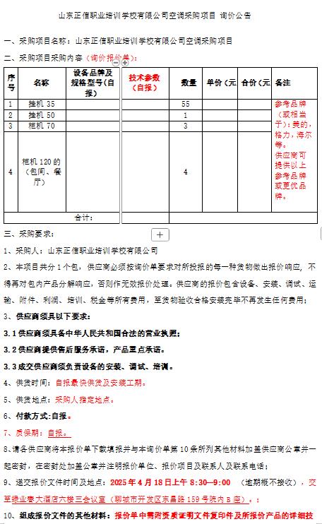 山東正信職業(yè)培訓學校有限公司空調(diào)采購項目詢價公告