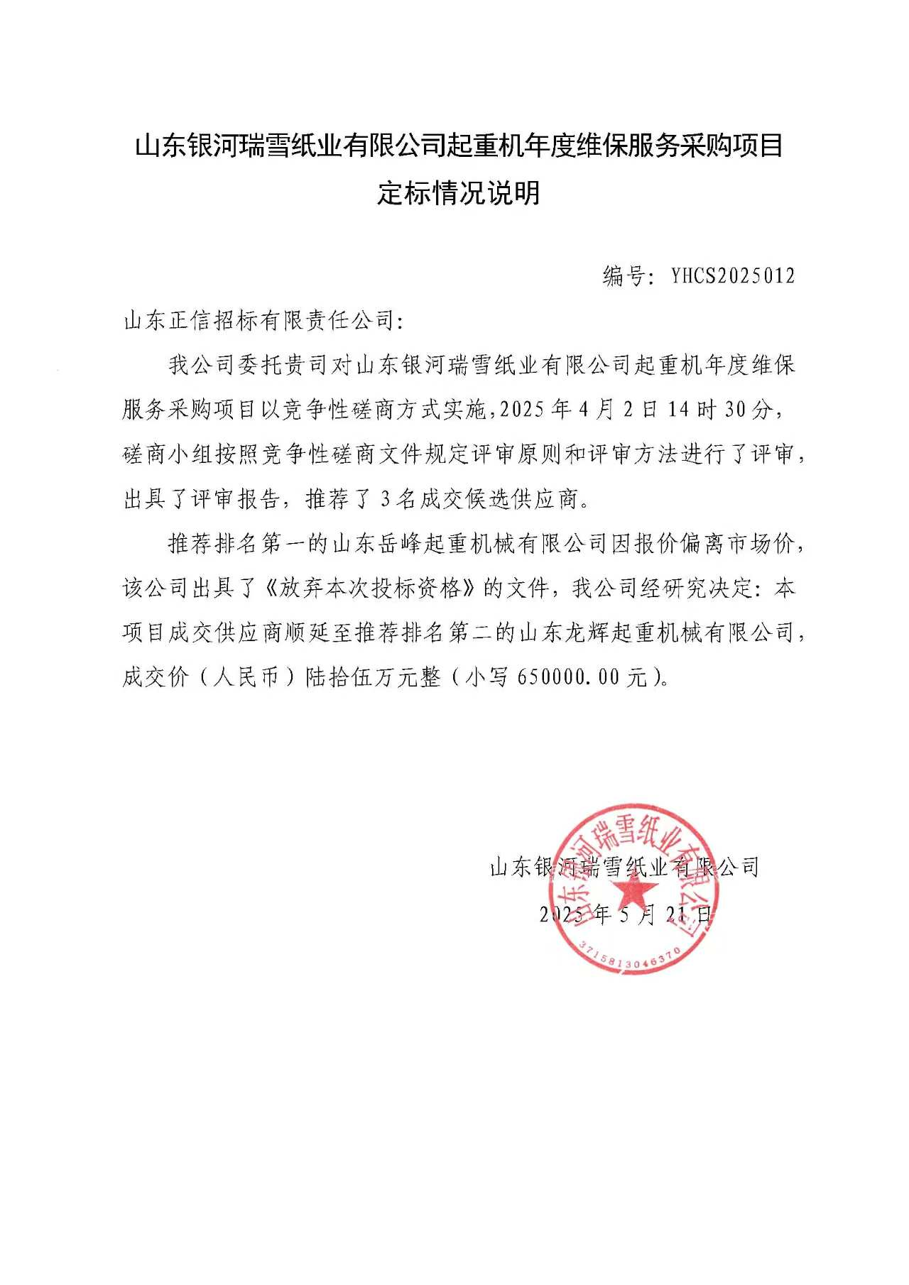 山東銀河瑞雪紙業(yè)有限公司起重機年度維保服務采購項目成交結果公告