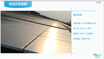 下面我跟大家介紹幾個案例,其中一個浙江余杭,它是國家18+12國家示范區(qū)的項目,總?cè)萘渴?50MW,這是典型離散式分布式的案例。此外還有山東沂水的項目,這是山東沂水地區(qū)最大的三級運營商,上海金山項目,10MW,5月份已經(jīng)成功并網(wǎng)了。山東齊河項目,5月份已經(jīng)成功并網(wǎng)。這是連云港光伏村的項目,這是中國光伏扶貧的南北的縮寫,是2013年天合配合江蘇省政協(xié)某個領(lǐng)導(dǎo)給予資金支持,然后就誕生了光伏扶貧的概念。本來有領(lǐng)導(dǎo)要去看一下,結(jié)果看了一下圖片,不能做推廣,不符合扶貧的概念,但是這個理念已經(jīng)帶來了模式的改變,光伏扶貧可能真正解決貧困人口的問題。
