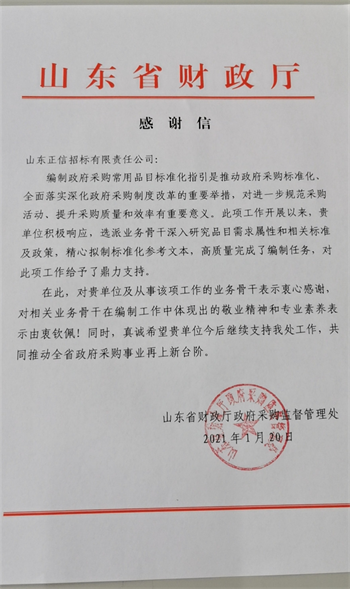 2021年1月20日,山東正信招標(biāo)有限責(zé)任公司收到山東省財(cái)政廳采購監(jiān)督管理處的感謝信,主要內(nèi)容是對正信招標(biāo)公司積極參與2021年山東省政府采購常用品目標(biāo)準(zhǔn)化指引和品目清單工作表示感謝。