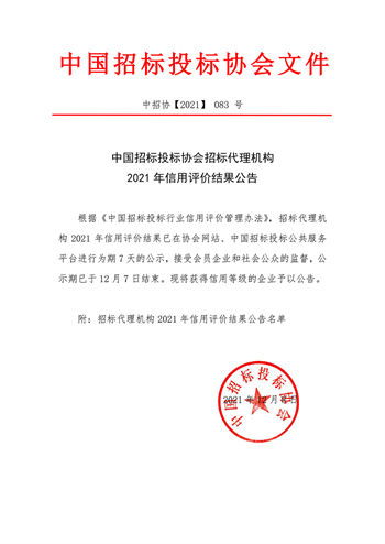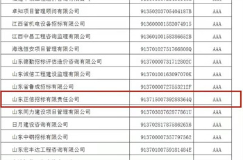 中國招標(biāo)投標(biāo)協(xié)會招標(biāo)代理機(jī)構(gòu)2021年信用評價于12月初進(jìn)行公示,山東正信招標(biāo)有限責(zé)任公司榮獲AAA信用等級。