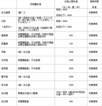 第三條 中央行政單位通用辦公設(shè)備家具購置費(fèi)預(yù)算標(biāo)準(zhǔn)包括實(shí)物量標(biāo)準(zhǔn)、價格上限標(biāo)準(zhǔn)以及使用年限標(biāo)準(zhǔn)三部分。